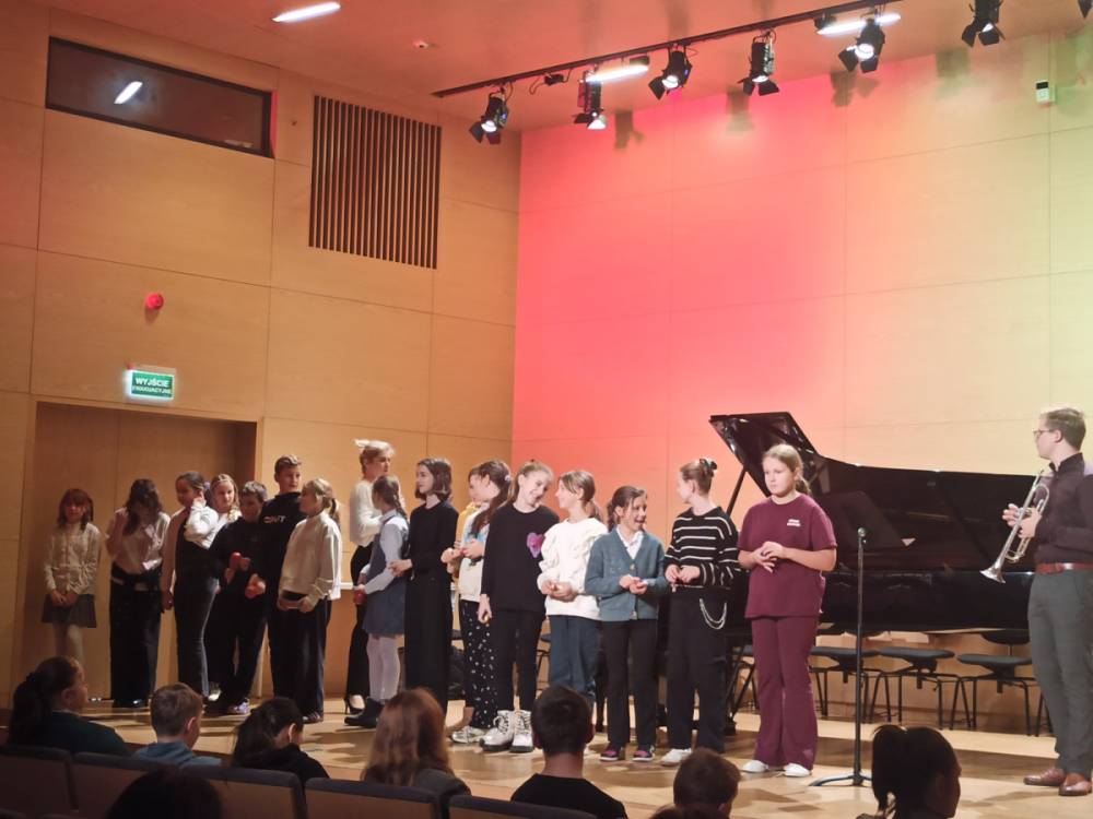 15 października uczniowie klas IV i V, pod opieką swoich wychowawców, wybrali się do Katowickiej Filharmonii na koncert umuzykalniający „Niezwykła moc blachy”. Podczas spotkania dzieci poznały budowę oraz najważniejsze informacje dotyczące instrumentów dętych blaszanych, takich jak trąbka i puzon. Uczniowie mogli nie tylko usłyszeć ich charakterystyczne brzmienie, lecz także posłuchać różnorodnych utworów dedykowanych tym instrumentom.